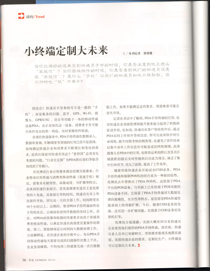 2013年4月份,《快递》报道优博讯在行业移动应用方面的发展情况,发布“小终端定制大未来”一文。