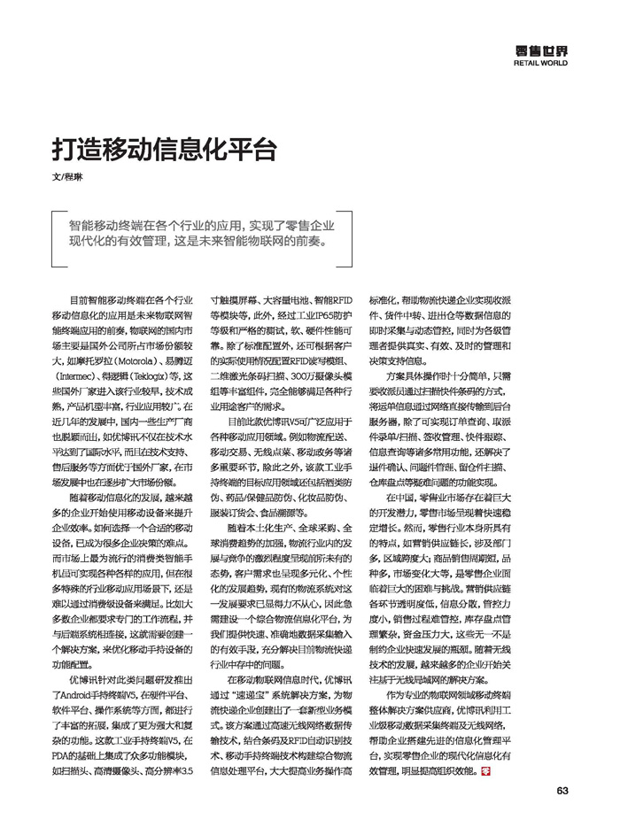 《零售世界》杂志2013年5月刊,针对移动信息化进行调研,对优博讯深入探讨并发布了“打造移动信息化平台”一文,报道优博讯在打造移动信息化平台事业上作出的努力。