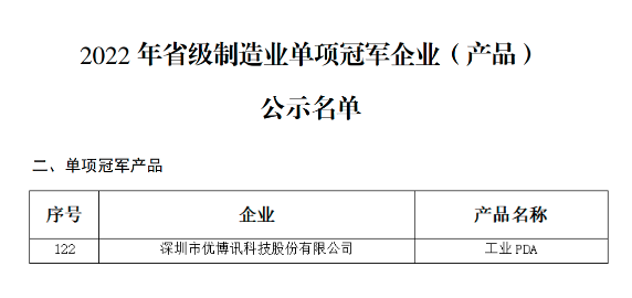 喜讯双至。近期,公司荣获工业PDA产品类别广东省制造业单项冠军企业的称号。优博讯作为国内AIDC行业的龙头企业,在制造业深耕多年,深刻理解智能制造的特殊需求,在作业管控、仓库管理、人员监督、设备管理等环节都为客户提供恰如所需的硬件设备和设备管理系统及云平台,帮助制造企业高效、精准、智能地进行业务和人员管理。