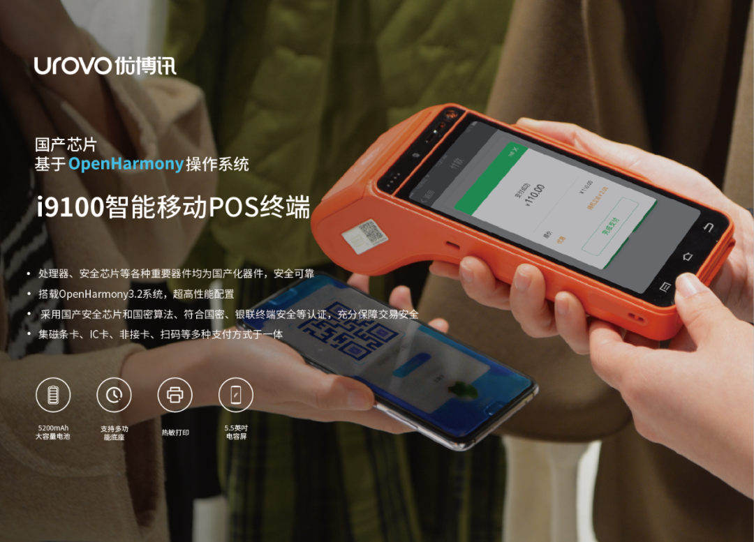 作为国内AIDC(自动识别与数据采集)行业龙头企业和OpenHarmony金融专委会会员,优博讯在金融支付领域有着深厚的积累和长远、完整的规划布局。届时在开放原子全球开源峰会展区,优博讯展台将重点展示最新技术成果。搭载OpenHarmony3.2操作系统的智能移动POS终端--i9100将在此次峰会惊艳首发,i9100的处理器、安全芯片等各种重要器件均为国产化器件,符合国密、银联终端安全等认证,自主可控,充分保障交易安全。此外这款设备集磁条卡、IC卡、非接卡、扫码等多种支付方式于一体,使用场景非常广泛。