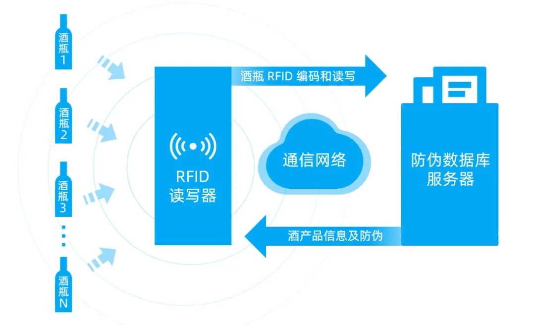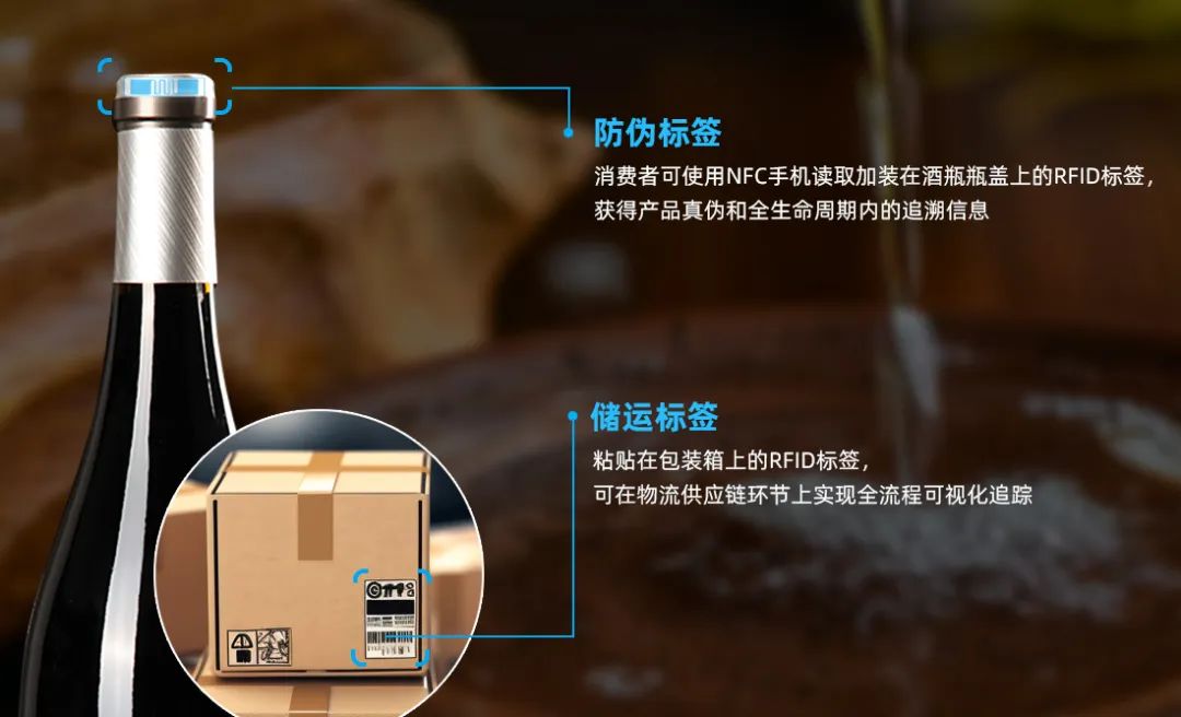 除了用作物流标签粘贴在包装箱上的RFID电子标签,箱内的每一瓶白酒瓶盖上都有一个RFID防伪查询标签,作为全球唯一的电子身份证。在白酒生产和销售的各个环节,酒厂可以通过不同权限的RFID终端设备获取标签内部的信息进行产品的追溯。