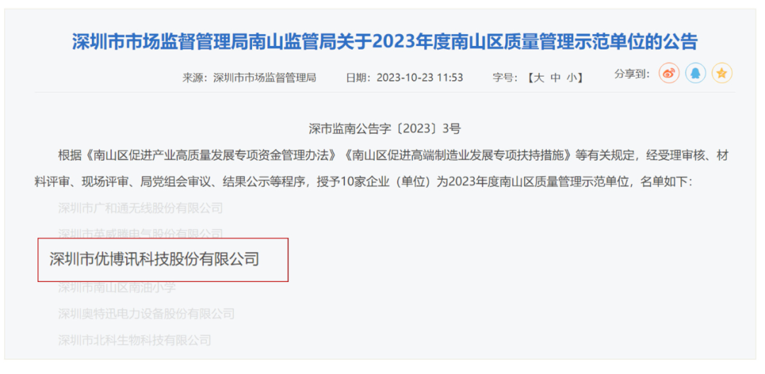 南山区质量管理示范单位是深圳市南山区人民政府设立的质量标杆奖项,奖项授予质量管理成效显著,产品、服务、工程、环保质量以及自主创新能力和市场竞争力等在国内外处于领先地位,对区域质量建设做出积极贡献的企业或组织。优博讯凭借先进的质量管理模式、独具竞争力的科技创新以及可持续的业务增长,成功获选首届南山区质量管理示范单位,成为深圳质量的标杆企业。